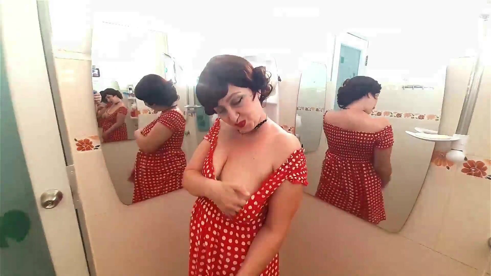 Pinup babe has no panties in front of mirror Retro Vintage Nude maid Housewife