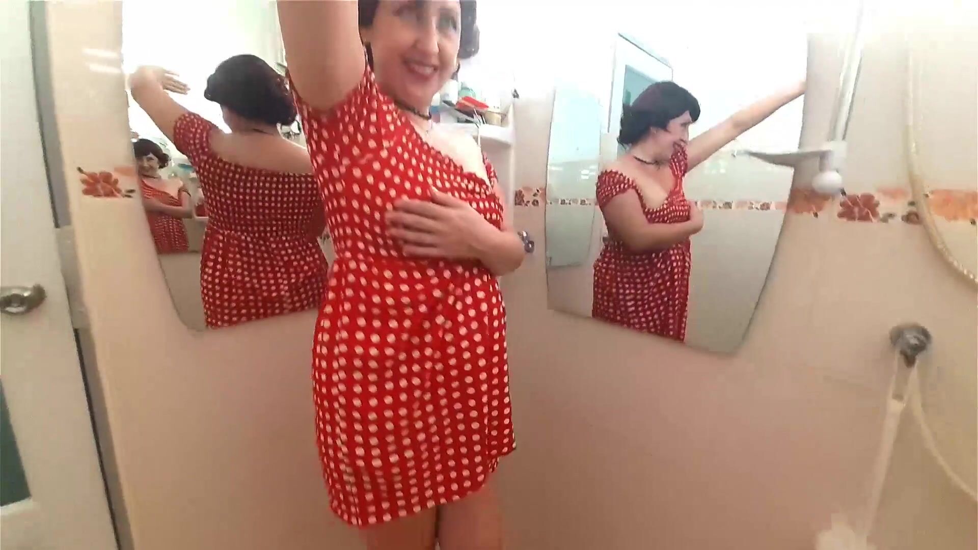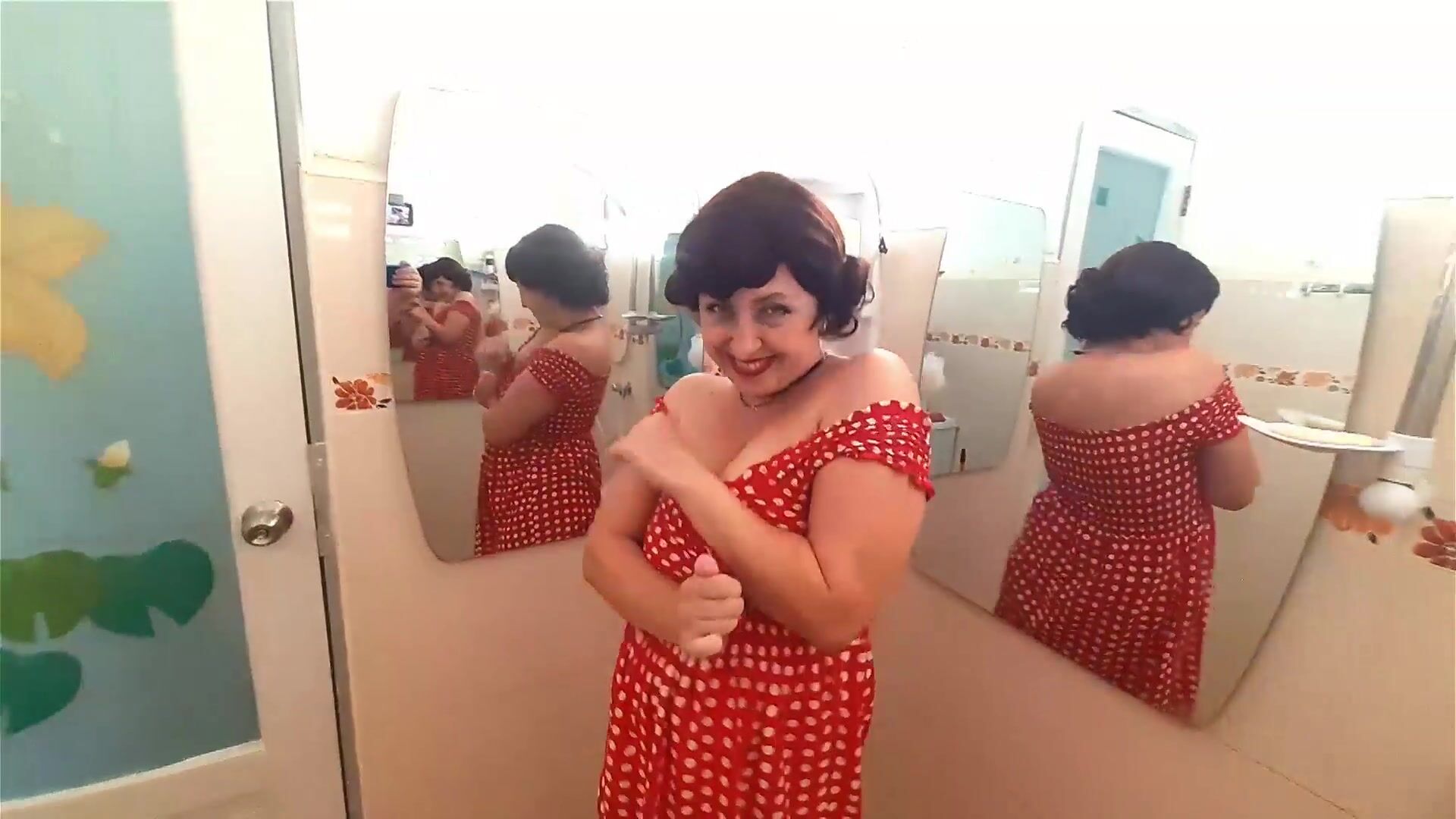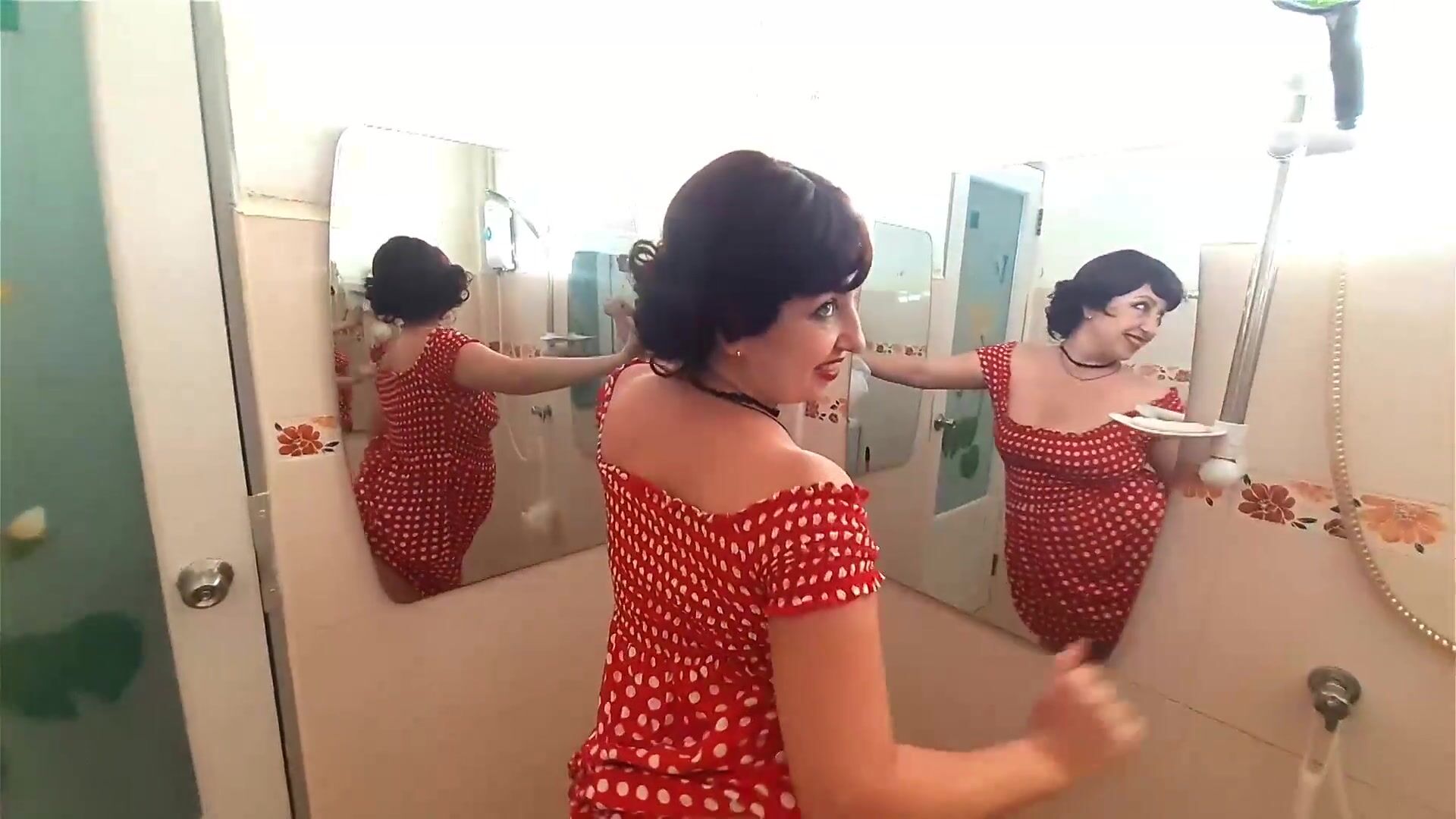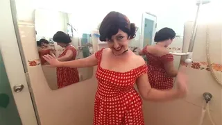 Pinup babe has no panties in front of mirror Retro Vintage Nude maid Housewife