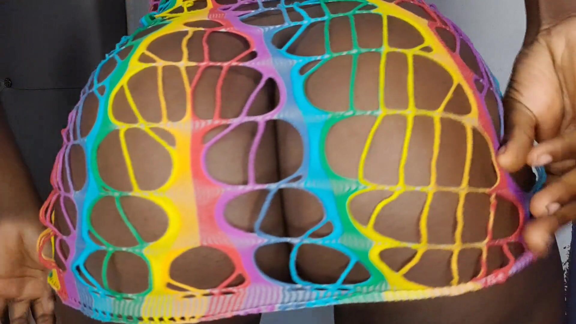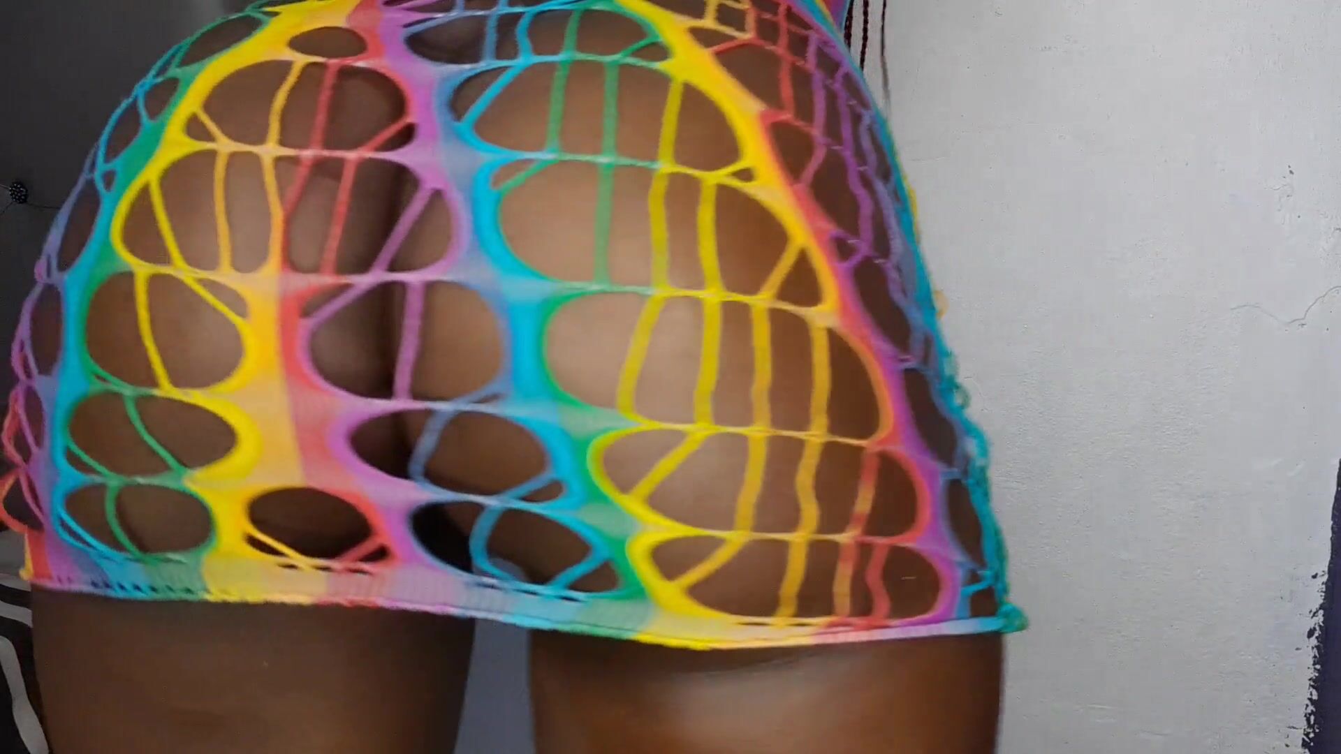 Big ebony milf shows bug oiled ass in rainbow lingerie