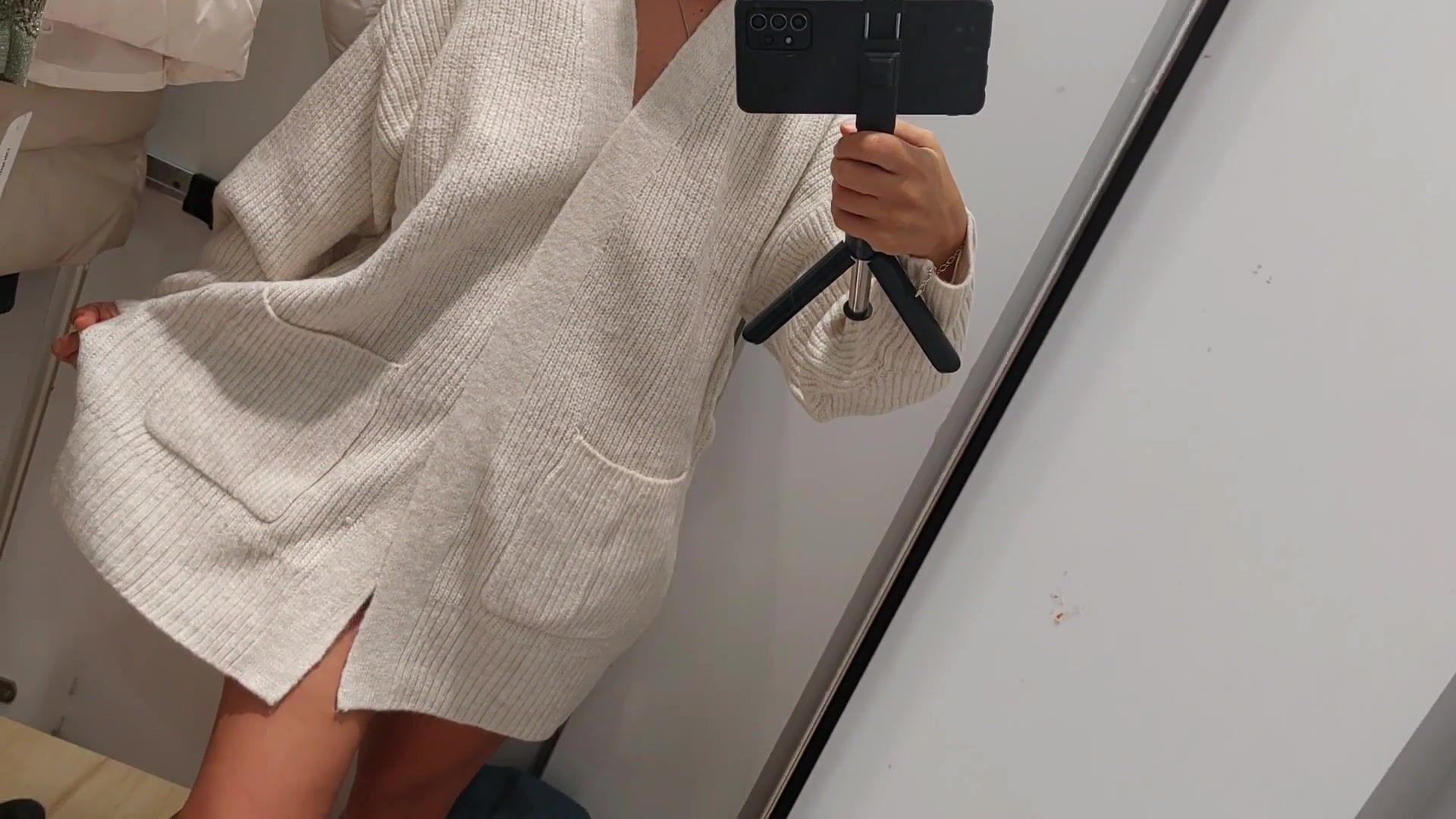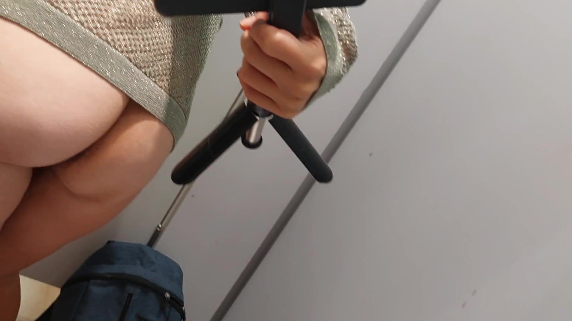 La moglie sexy con il culo grosso e i capelli della figa prova i vestiti. Figa calda con capelli cas