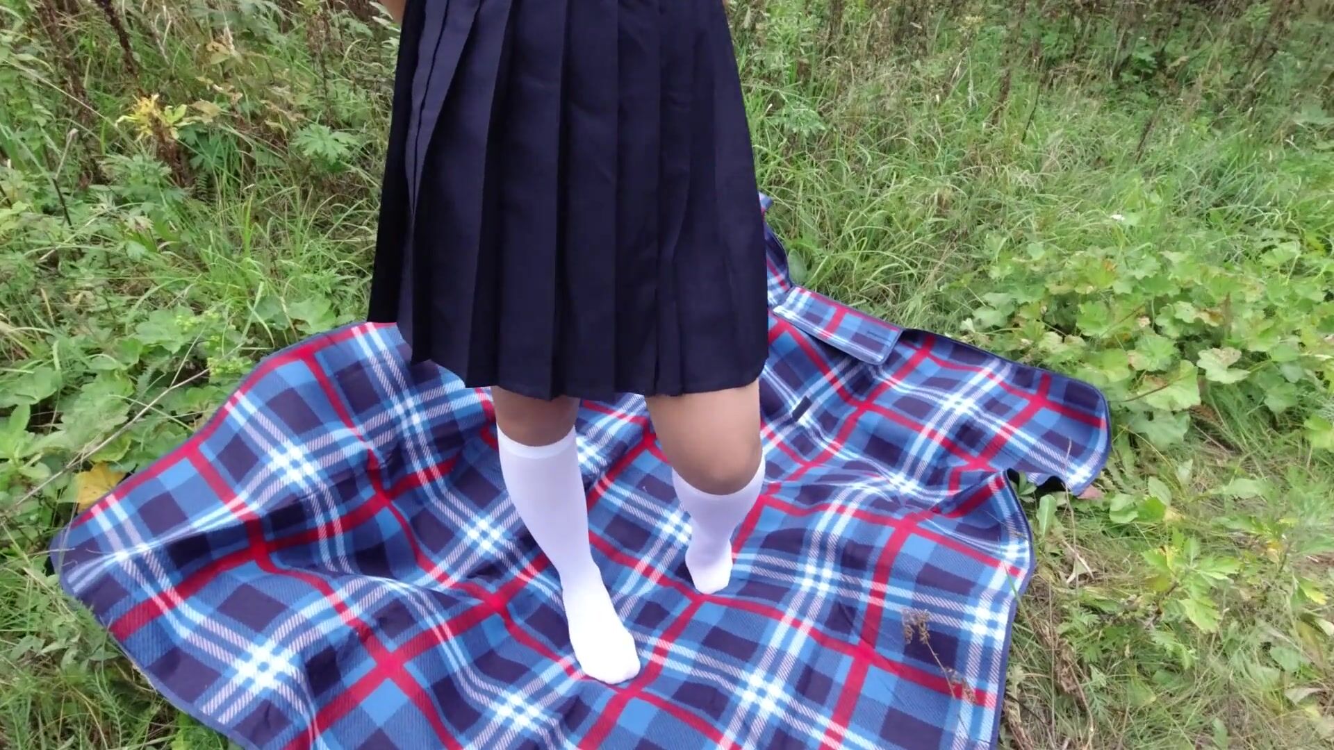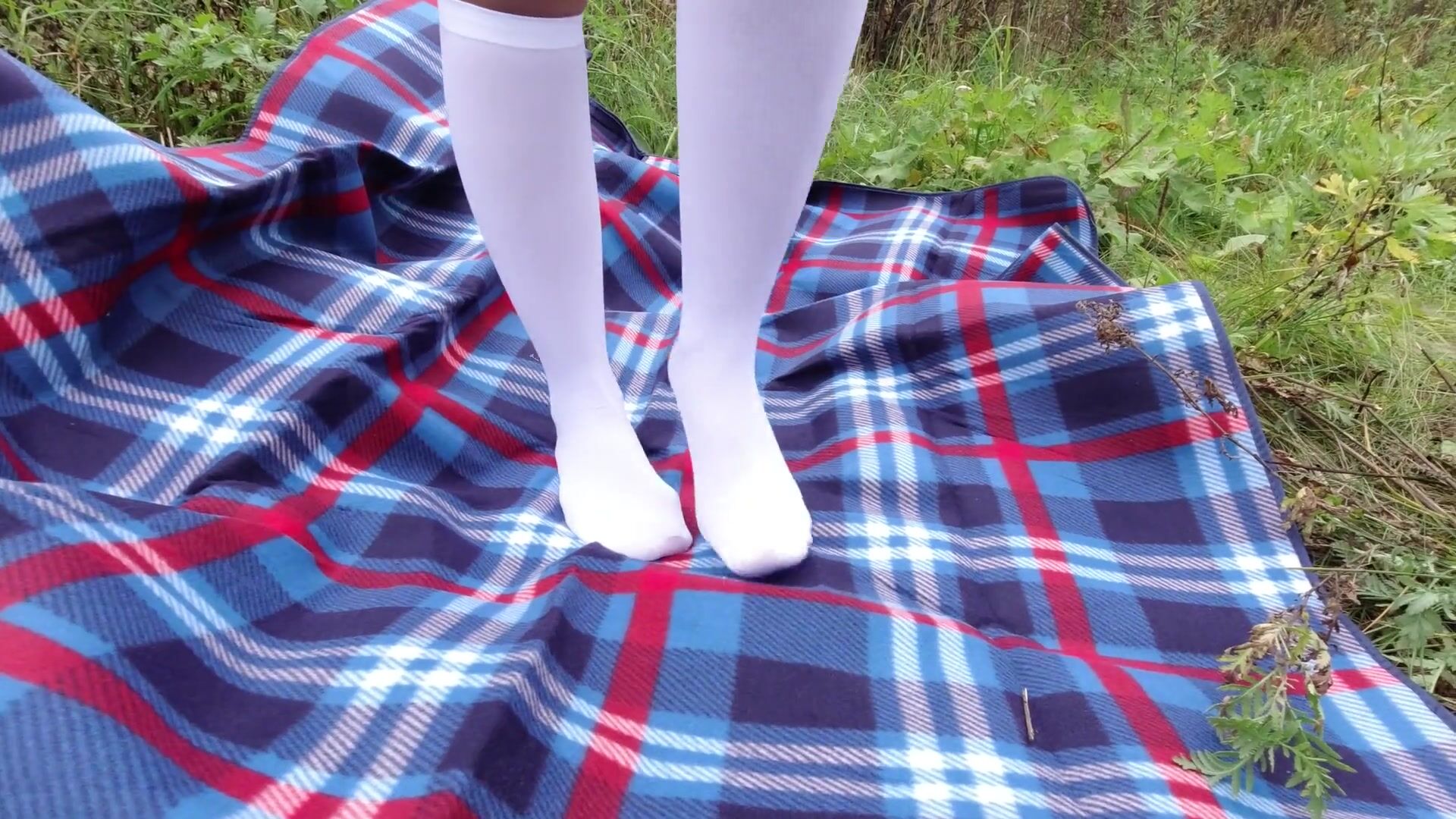 Schoolgirl in uniform shows legs feet foot in white knee socks and pantyhose under skirt