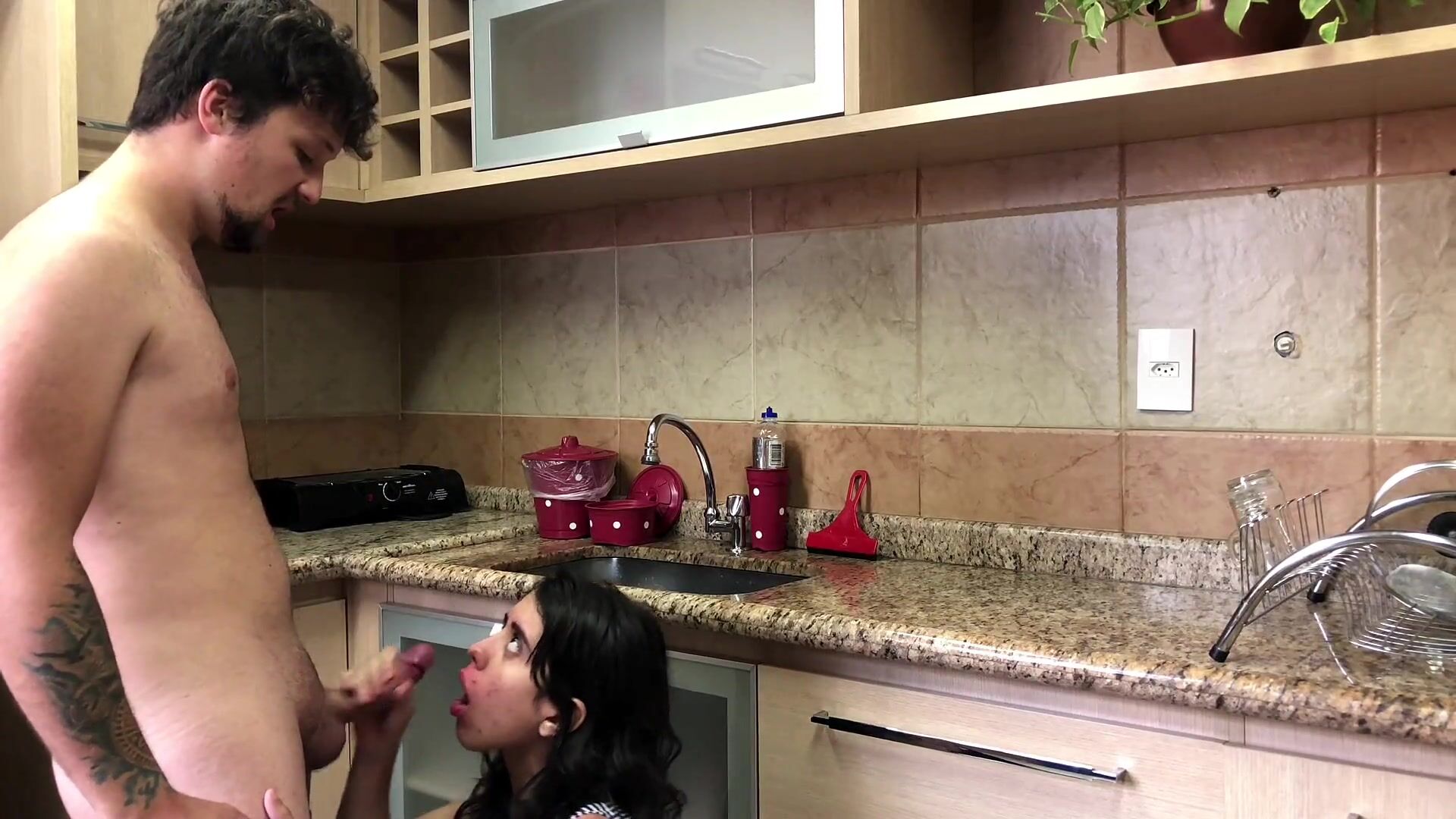 I took my maid washing dishes and ate her pussy until she filled her face with cum